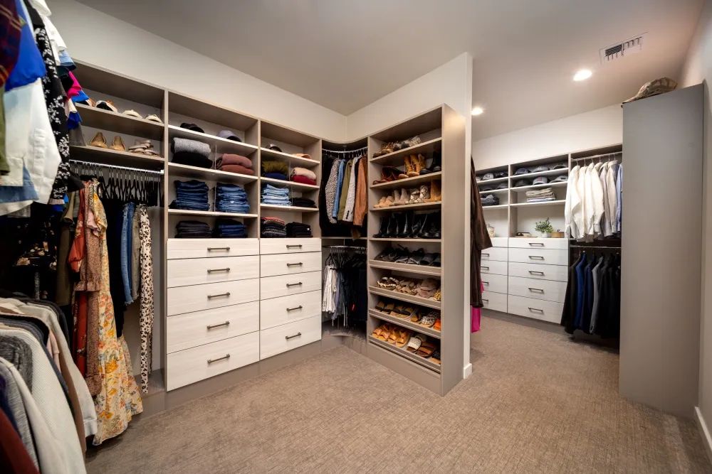 Determining your needs guides the discussion for the actual closet design. If you have a lot of long dresses, you’ll need more tall rod space; if you have a lot of t-shirts and sweatshirts, you have to ask yourself if you’re more likely to hang or fold them. If you have a lot of things that need to be folded, shallow shelves and drawers can help keep things neat and organized so you’re not reaching for something at the bottom and knocking over a tall tower of clothes.
