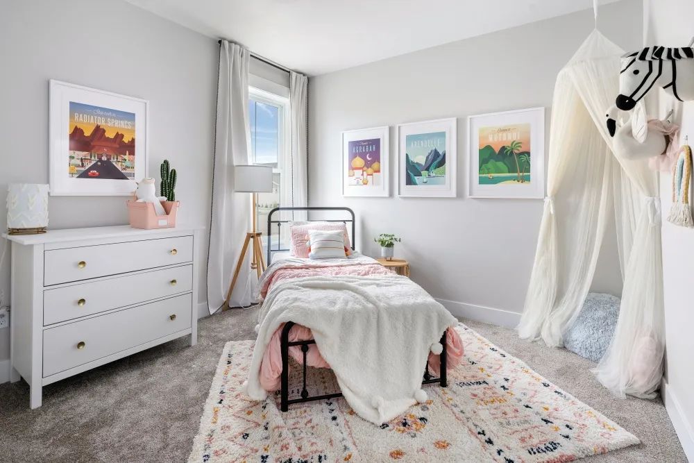 Off the living room, two other bedrooms and a bathroom complete the home. In decorating Parade homes, I always like creating an imaginary family and ensuring the spaces work for them. This year, our family features an only child. She’s a little girl who dreams of visiting the places in her favorite movies. Her mom works from home and uses the final bedroom as her office space.