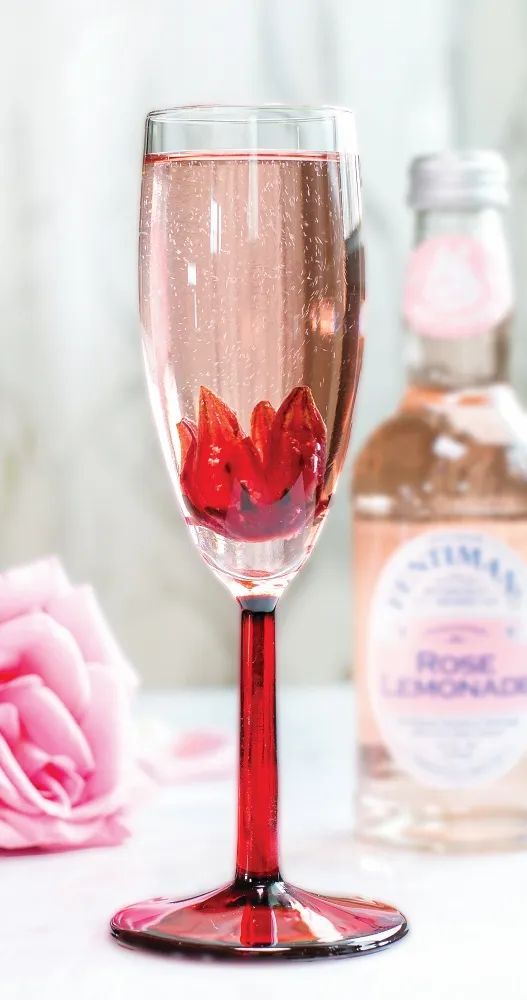 To create this simple and flavorful mocktail, place a roselle flower in a wine glass or a champagne flute and top with Fentiman’s Rose Lemonade. Add a splash of rose syrup if desired, for a more distinct rose flavor.