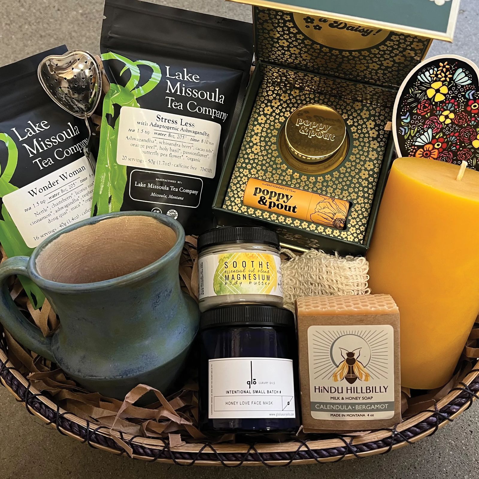 Thoughtfully curated gift baskets from Frae Everyday Goods featuring handcrafted mugs, teas, candles & more ($10-$50).
