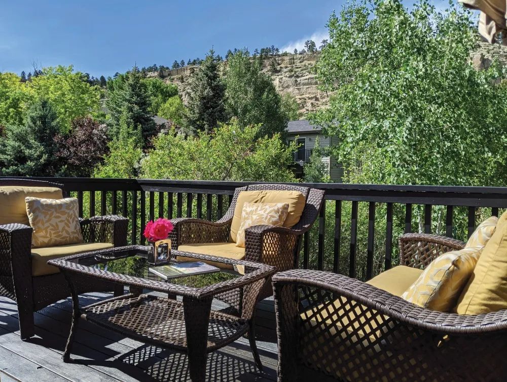 A very comfortable but old-fashioned lounge set (see before photo) from a big box store had served us well for the better part of a decade. I felt it was time to get rid of the tired synthetic wicker look and mustard upholstery (to be completely honest, I was never a big fan of that color). Finding an equally comfortable set was time-consuming due to the vast number of options out there. I wanted a conversation set. And a rocker. And a comfortable chair to sink into. Preferably all in one, but I couldn't find such a thing. Instead of buying one large set to replace the old one, I opted for separate pieces that seemed to go well together. The starting point was a set of two dark gray comfy chairs for lounging around with a friend over a glass of wine. Then I added two metal rocking chairs with an even better outdoor life expectancy - not that it rains a lot during our hot Montana summers, but you never know. Their bright yellow color, contrasting nicely with the dark gray, still makes me smile every morning when I go out there with my first cup of coffee. They came in a set with a small, sculptural, yet sturdy, matching table that was just perfect for the limited space we have. The furnishing part was completed with the addition of an egg swing chair with a stand, which went on to become the perfect spot for snuggling in with a book.