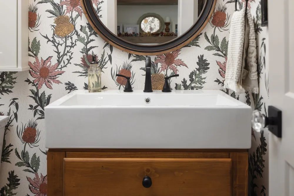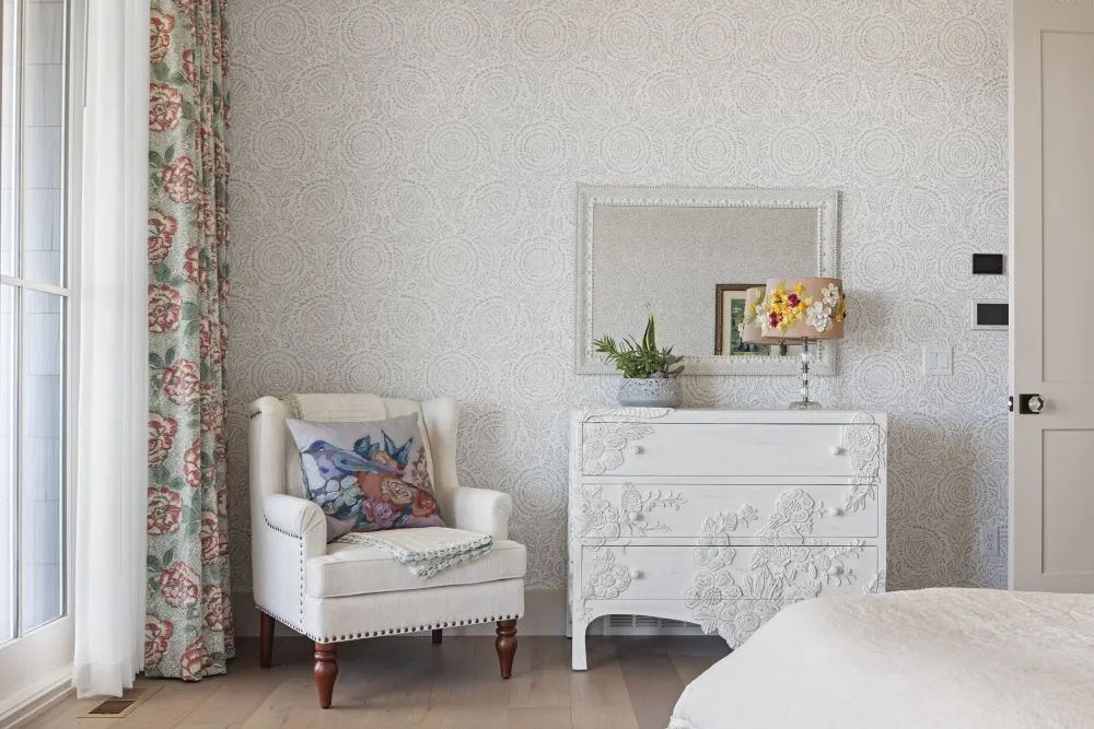 The four bedrooms and three bathrooms throughout the home are each fabulously adorned in unique wallpaper prints, each evoking its own splash of color, personality, and mood. In addition, nearly every room in the home displays a white, shiplap paneled ceiling, adding visual intrigue and a rustic, farmhouse tone.