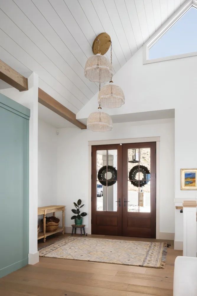 The foyer’s woven, wicker-like pendant lighting is a conversation piece impossible to miss.
