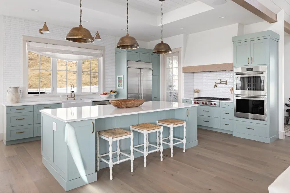 If the panoramic views are the star of the show, the home’s remarkable farmhouse kitchen is a close runner-up. The antique brass pendant lights, retro fixtures, crisp Roman shades, Flemish glass, and pocket pantry door are rustic and homey yet still exhibit luxury and a modern edge.