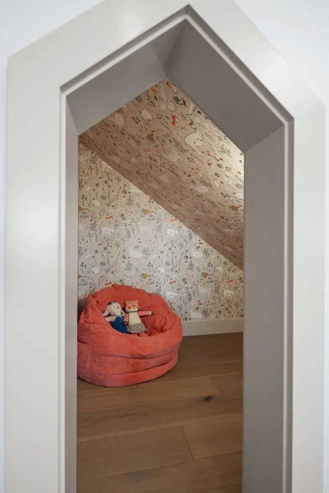 The cozy, dimly lit, under-stairway book nook provides a quiet sanctuary.
