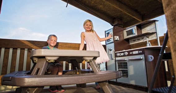 - Mia loves serving snacks, lunch, and hosting friends for pretend parties in her shaded kitchen with a picnic table.