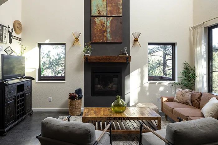 In lieu of traditional flooring, stained concrete blankets the floor. The Roman Clay fireplace surround goes up the length of the 21-foot ceiling.