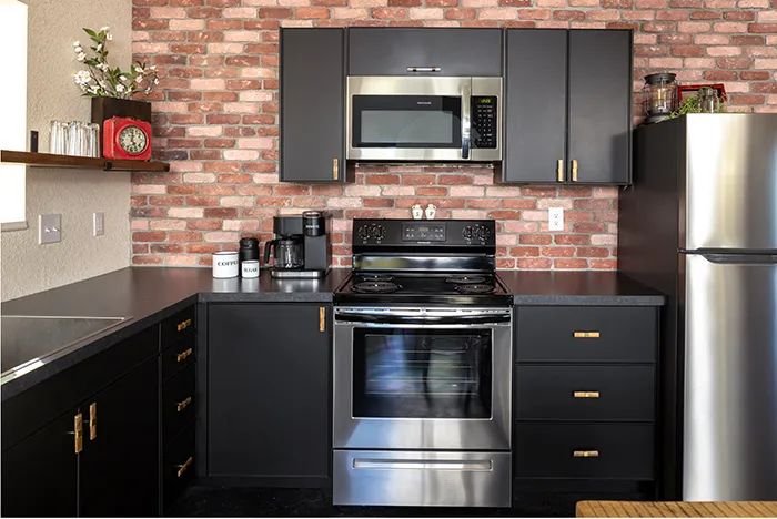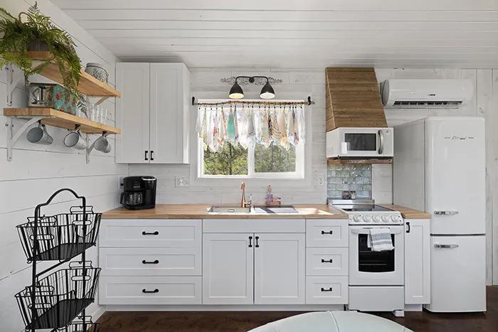 The mini stove, in-sink dishwasher, and mini fridge are all uniquely styled and, with their small footprint, lend more space for living.