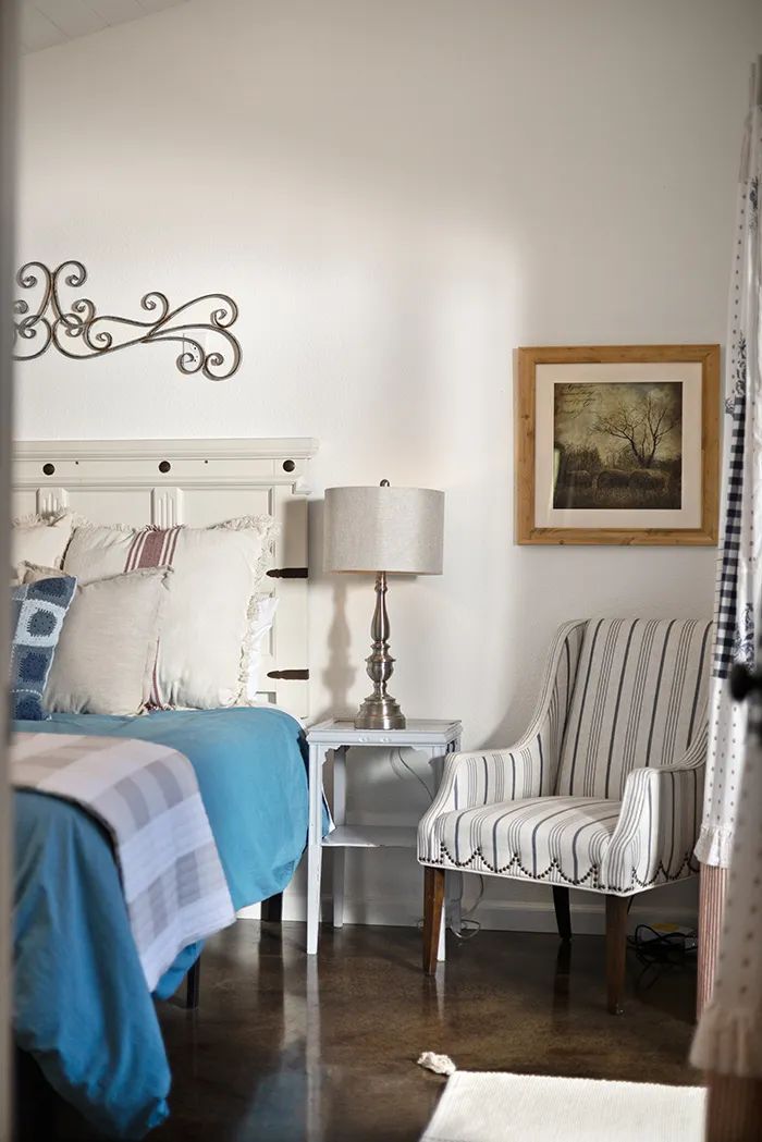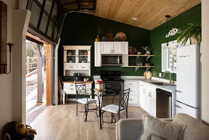 From repurposed shutters serving as attic doors, vintage side tables made into vanities, and reclaimed shelving turned into a coffee bar, the interior design delights at every turn. The one-of-a-kind glass garage door pours bright light into the kitchen and, when rolled up, blurs the lines between inside and out, making for the ultimate indoor-outdoor experience.