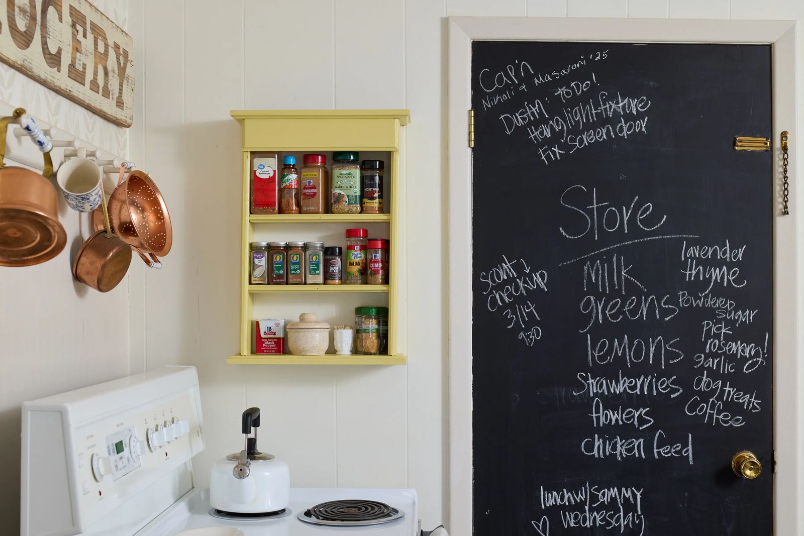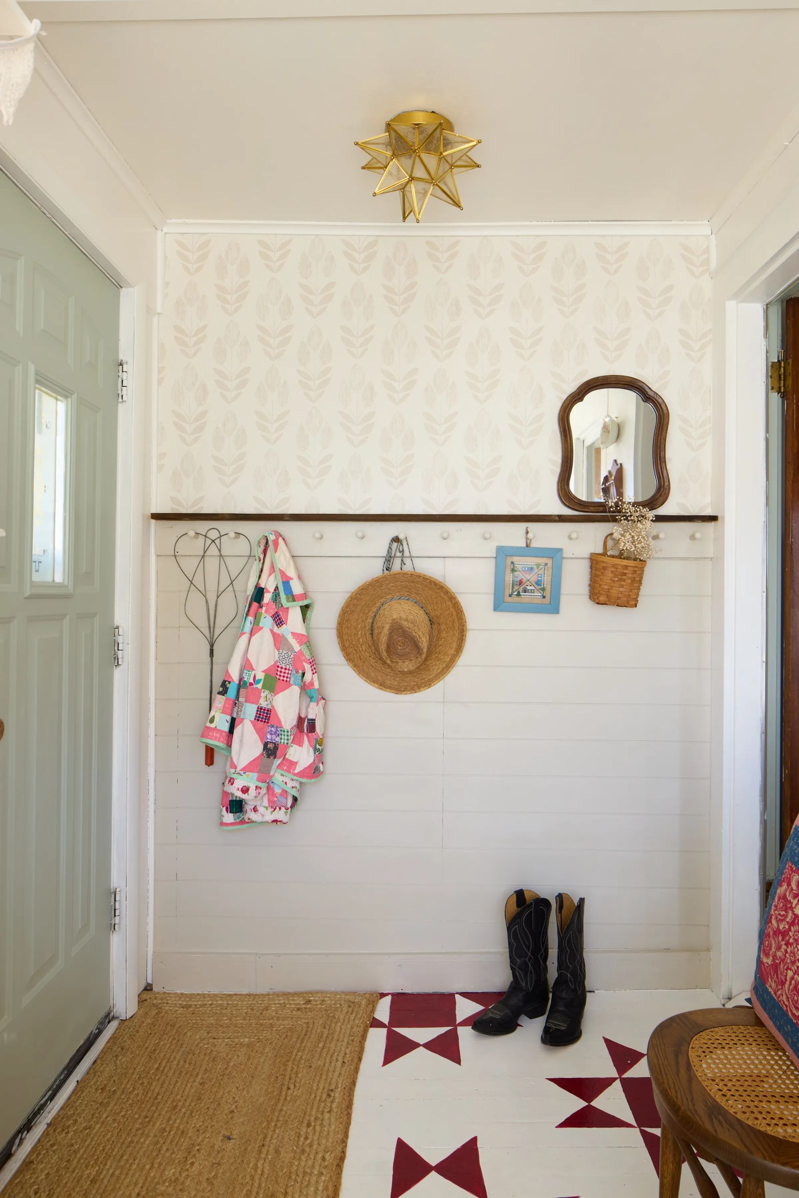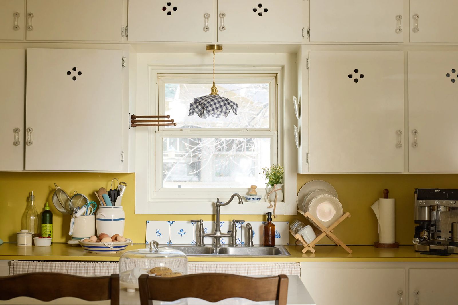 Instead of gutting the house, they chose to make gradual updates. The kitchen retains its original deep cabinets and retro yellow countertops. “At first, the countertops bothered me,” she admits. “But now I’m so glad we kept them. They’re charming.” Instead of replacing everything, they painted wood paneling, updated light fixtures, and installed a black-and-white peel-and-stick kitchen floor after receiving a much higher quote for traditional tile. The affordable option worked, and the impact it made on the space was well worth it.