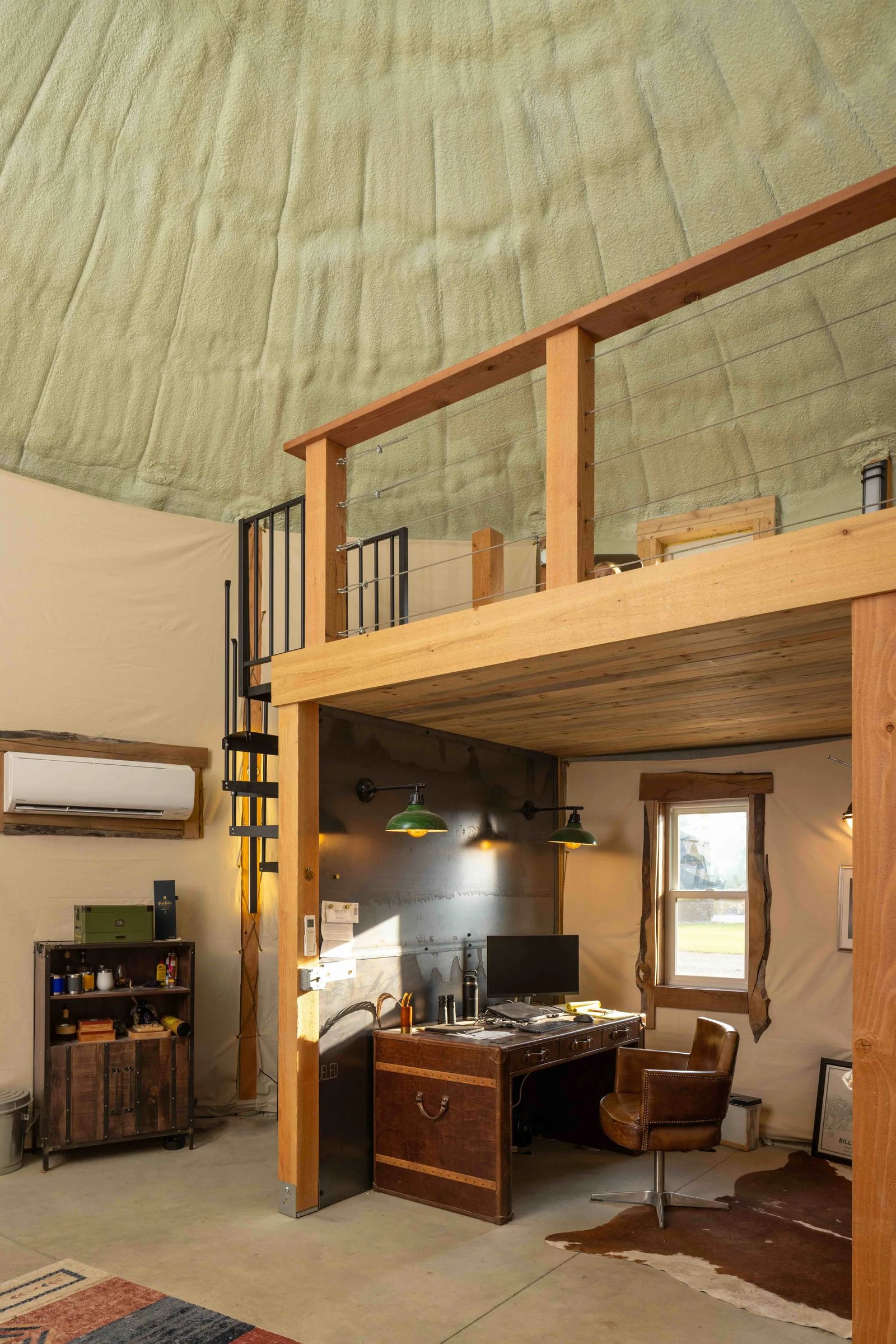 Most people drywall over insulation, leaving silos functional but often uniform in appearance. Jeff wanted something completely different. He envisioned a bold approach: cutting and placing stretched canvas panels over the insulation, creating a soft, textured backdrop that highlights other striking elements, including a handcrafted steel wall installation. The result is a rustic-modern aesthetic that is warm, inviting, and unique. At roughly 600 square feet with a loft, the silo feels unexpectedly open, offering a versatile and dynamic space that balances comfort, style, and creativity.