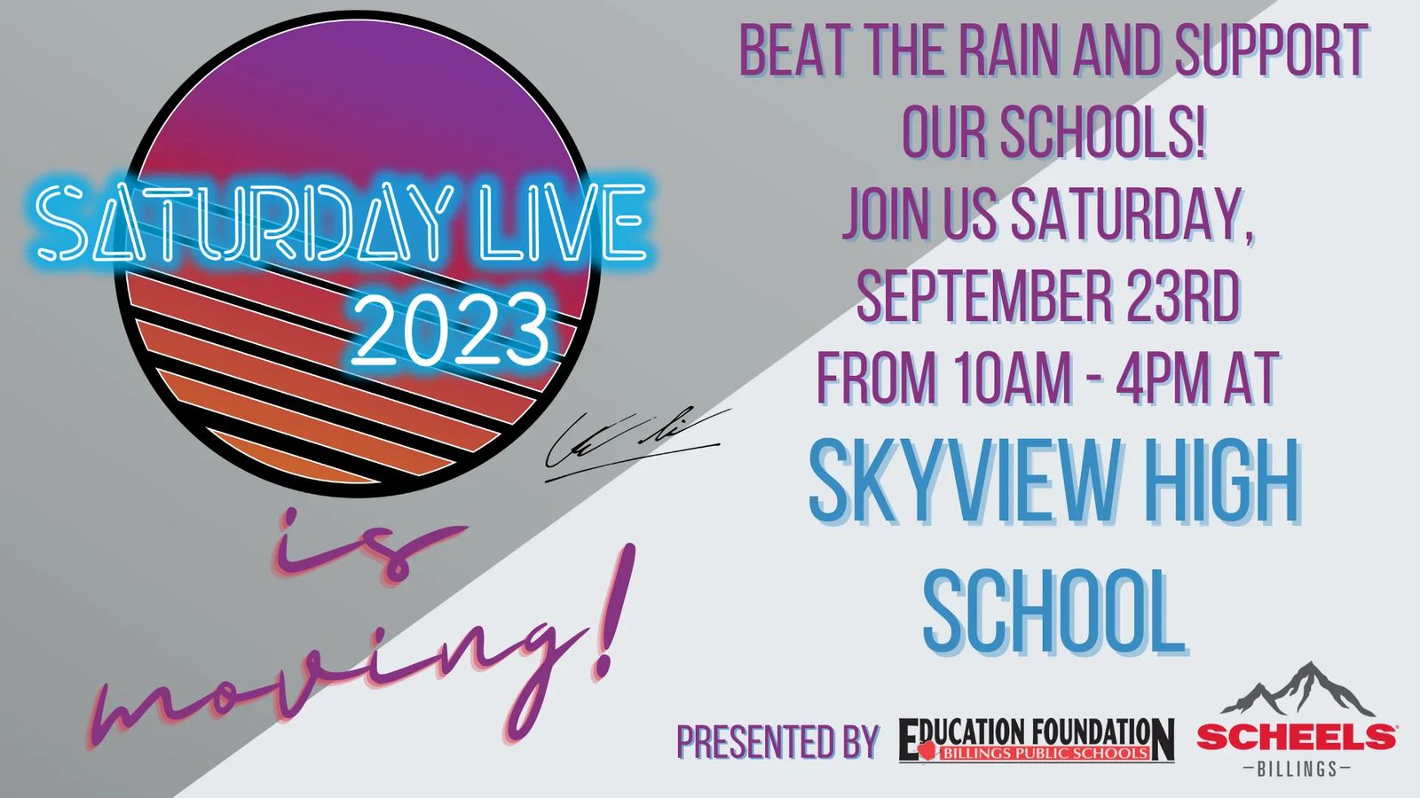 The forecast for this weekend has forced a venue change for Billings Education Foundation's 31st annual Saturday Live, originally (and traditionally) scheduled to be held at Pioneer Park will now be held indoors at Skyview High School. Held on Saturday. September 23 at 10 a.m. - 4 p.m., Saturday Live is the largest school carnival in the region and is a critical fundraiser for schools in our community.