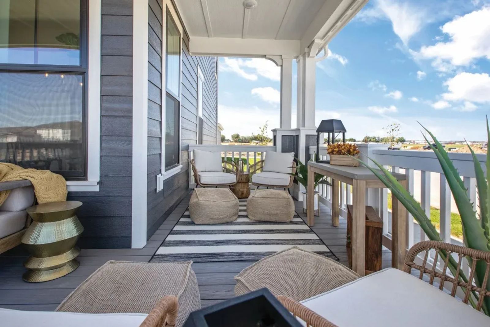 Mix textures. Stone pavers or decking (natural wood or composite material) give off more character than broomed concrete. However, it’s easy to jazz up a concrete patio with an outdoor rug. And a rug gives you the freedom to change up the feel any time you’d like without a high cost while anchoring and unifying your patio furniture.