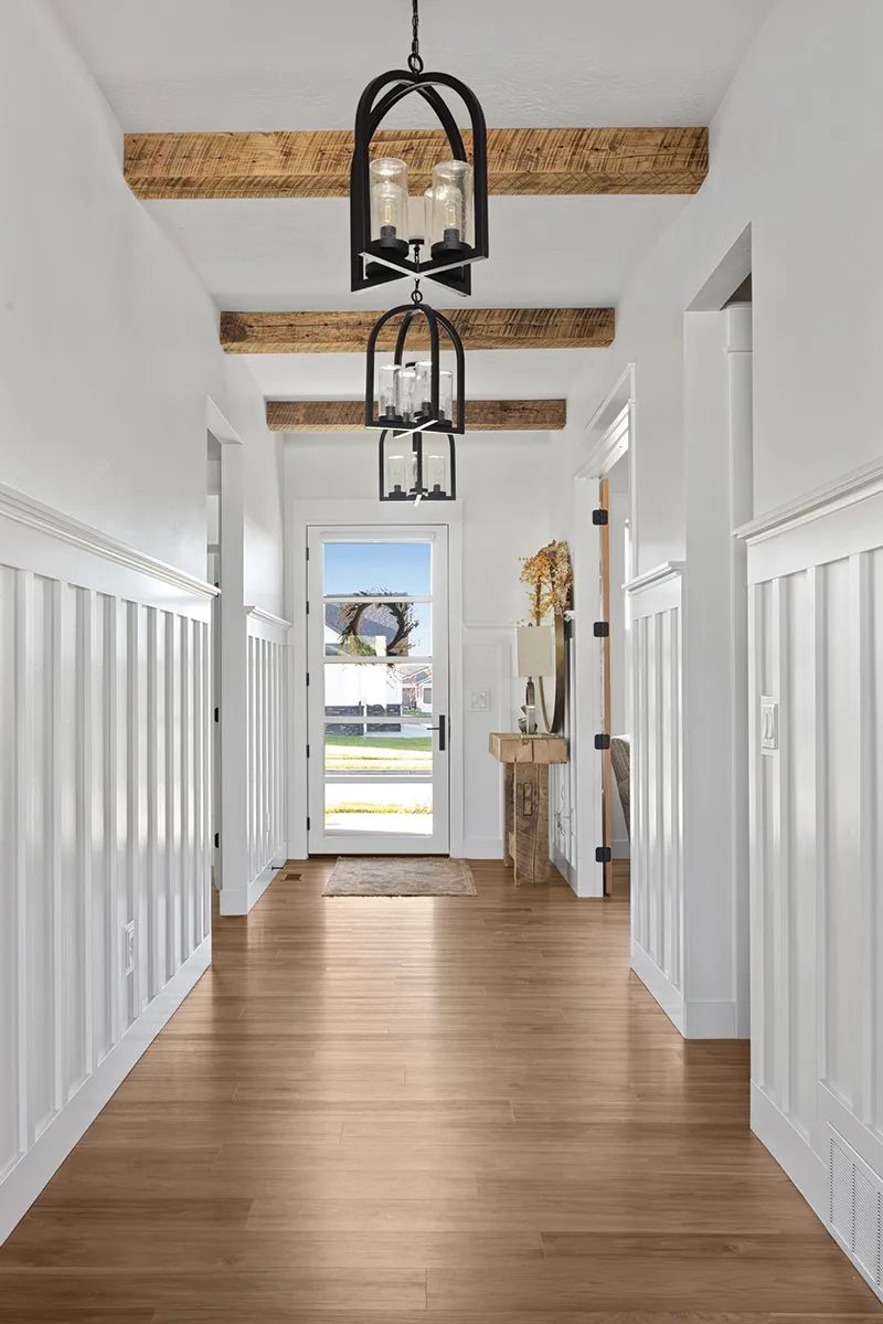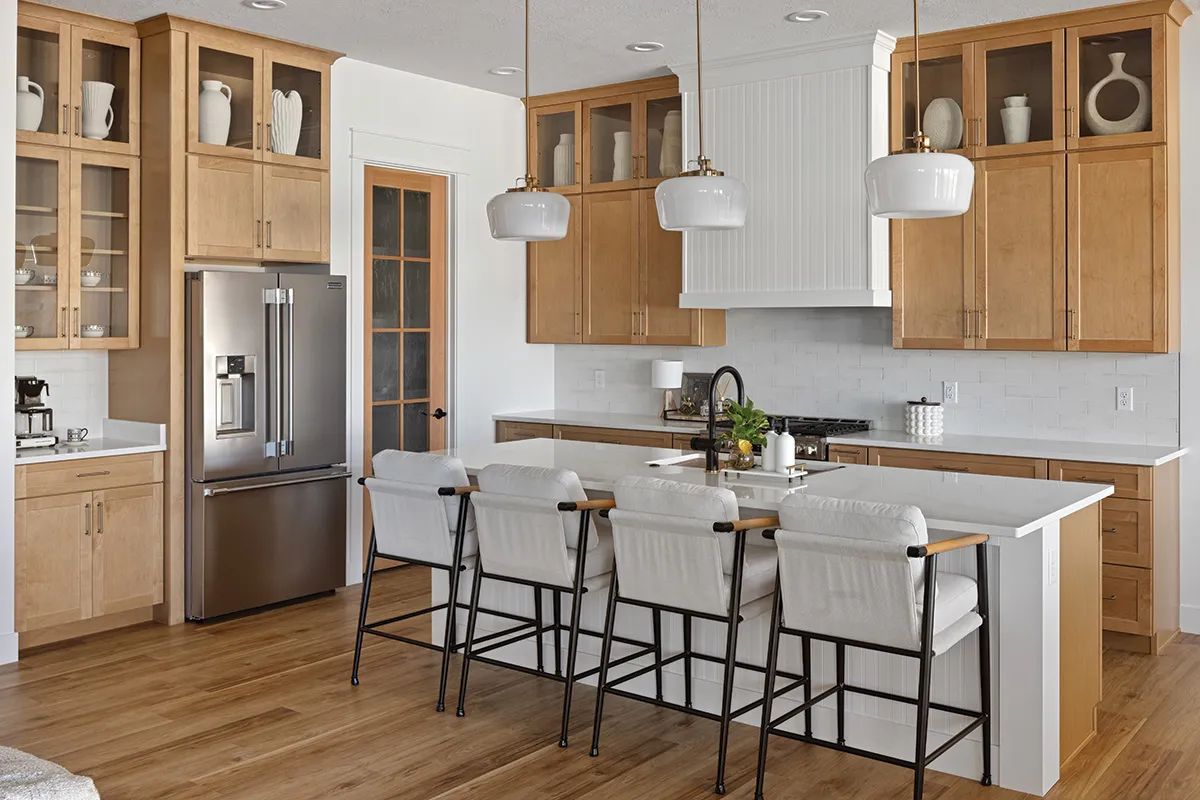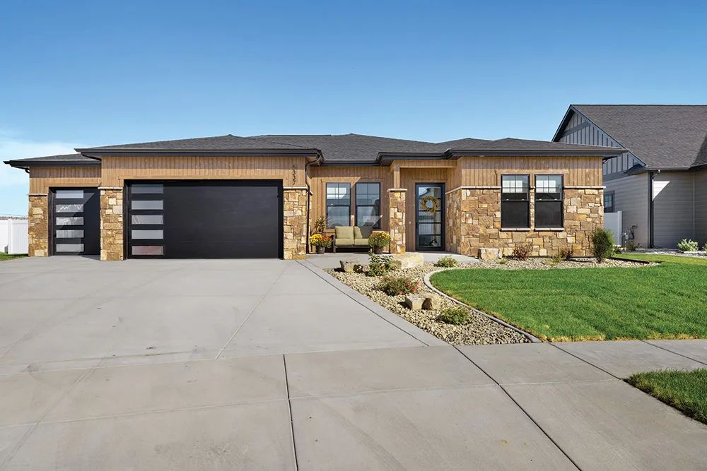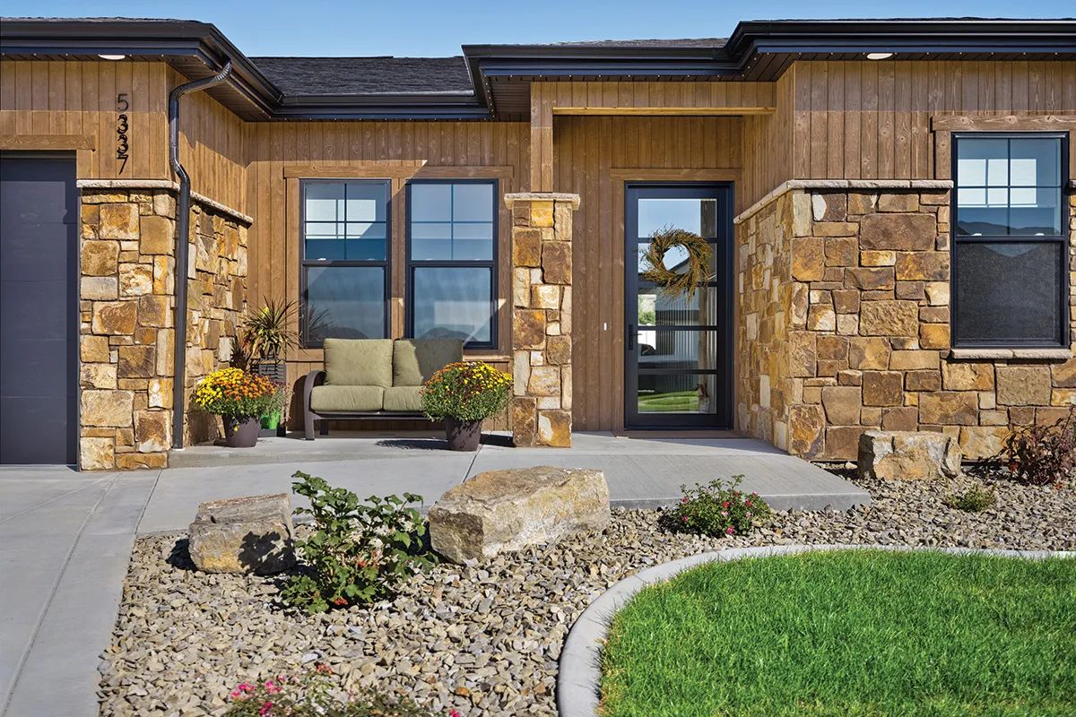 The home’s exterior offers depth, dimension, and delight right from the start. The rough-edge sandstone blocks accent the vertical, pre-finished wood siding. The impressive 8-foot-tall glass panel door is stylish and welcoming.
