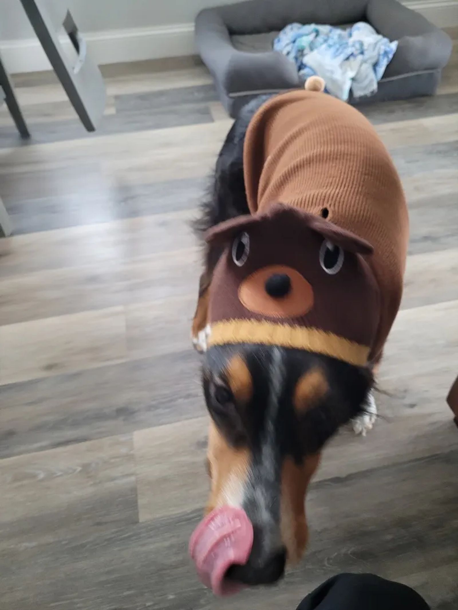 For Christmas my parents bought me a bear sweater. First of all, this is embarrassing because as I mentioned above, I am a buffalo not a bear. Second, it has a hood that my dad thought would be cute to put on my head (insert head tilt). It was so embarrassing!