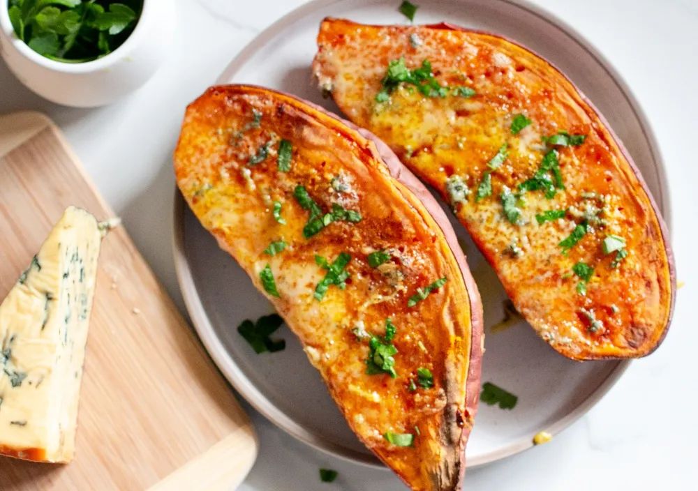Wash the potatoes thoroughly. Slice them in halves and coat them with coconut oil. Bake at 425 F for 30-45 min (oven temperatures might vary). When soft and slightly brown, remove from the oven and add the cayenne pepper. Top generously with Stilton and return to the oven for another minute or two, unless the cheese has melted. Garnish with flaky Maldon salt and roughly chopped parsley, and enjoy immediately.