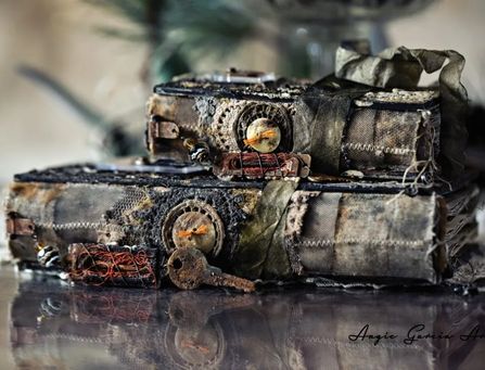 Angie describes herself as “an artist who loves to learn and experiment,” so there’s always something new developing in her work. She works with a wide range of media, including plaster, wood, oil, acrylic, watercolor, paper clay, jewelry, junk journals, photography, and encaustics (beeswax and crystallized tree sap often fused with other media using heat). She loves to repurpose found objects into her art and deeply appreciates anything rusty; the rustier, the better.