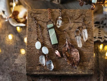 Today, Angie lives just outside Butte on the Big Hole River, where she collects inspiration and materials from a nearby quartz mine and several rustic abandoned cabins. She is currently working with electroformed copper organic jewelry, a process of electrically bonding metals to organics like pinecones, tree branches, and even crystals. She’s also experimenting with combining copper and semi-precious stones to create wearable jewelry and chakras that can be hung in one’s home to attract good energy and balance.