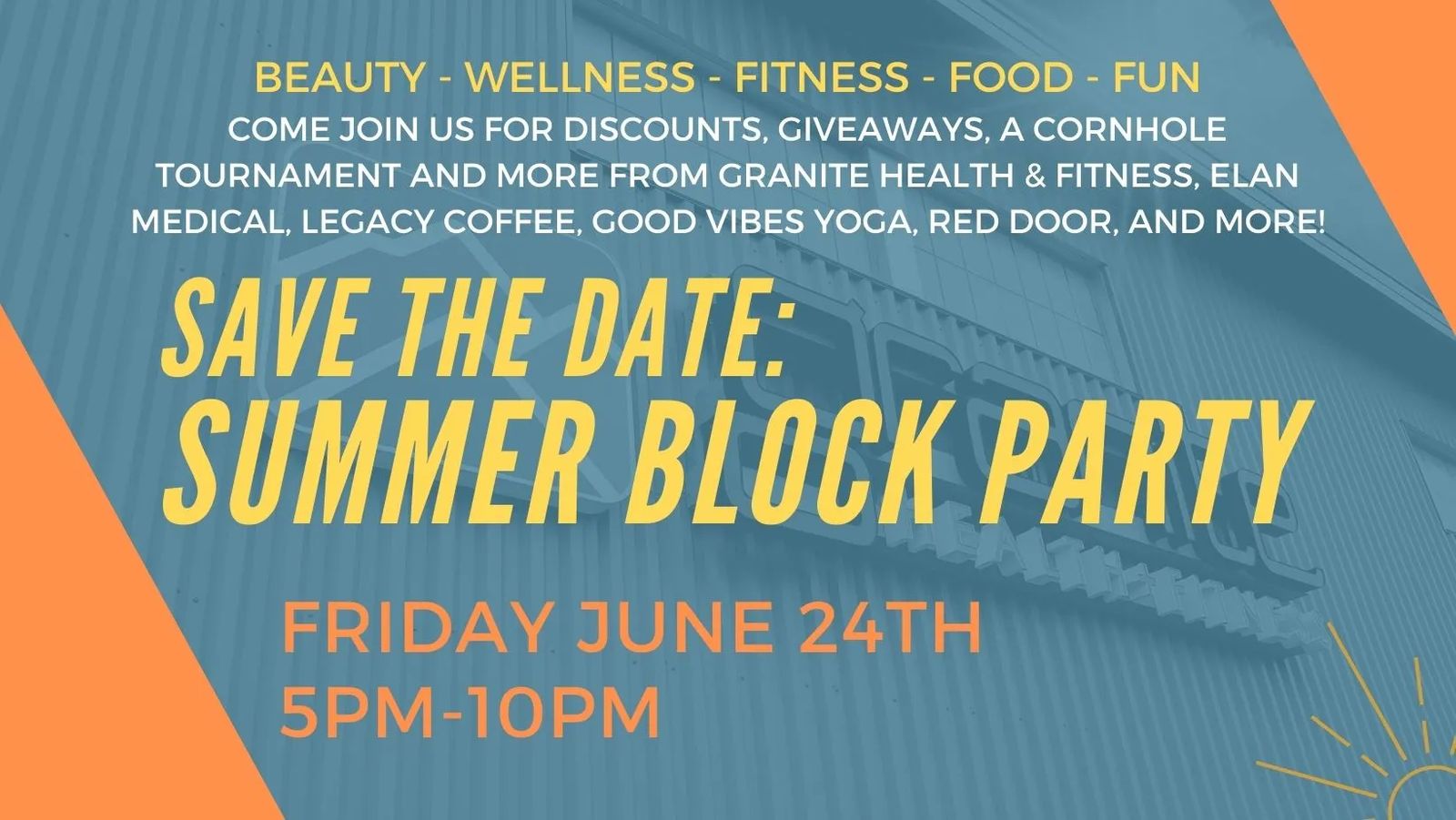 Nothing says summer quite like a block party and that's what Granite Health & Fitness, Elan Medical, Legacy Coffee, Good Vibes Yoga, and the Red Door are bringing to the West End on this Friday evening. Come join in the fun for discounts, giveaways, food, live music, and a cornhole tournament.