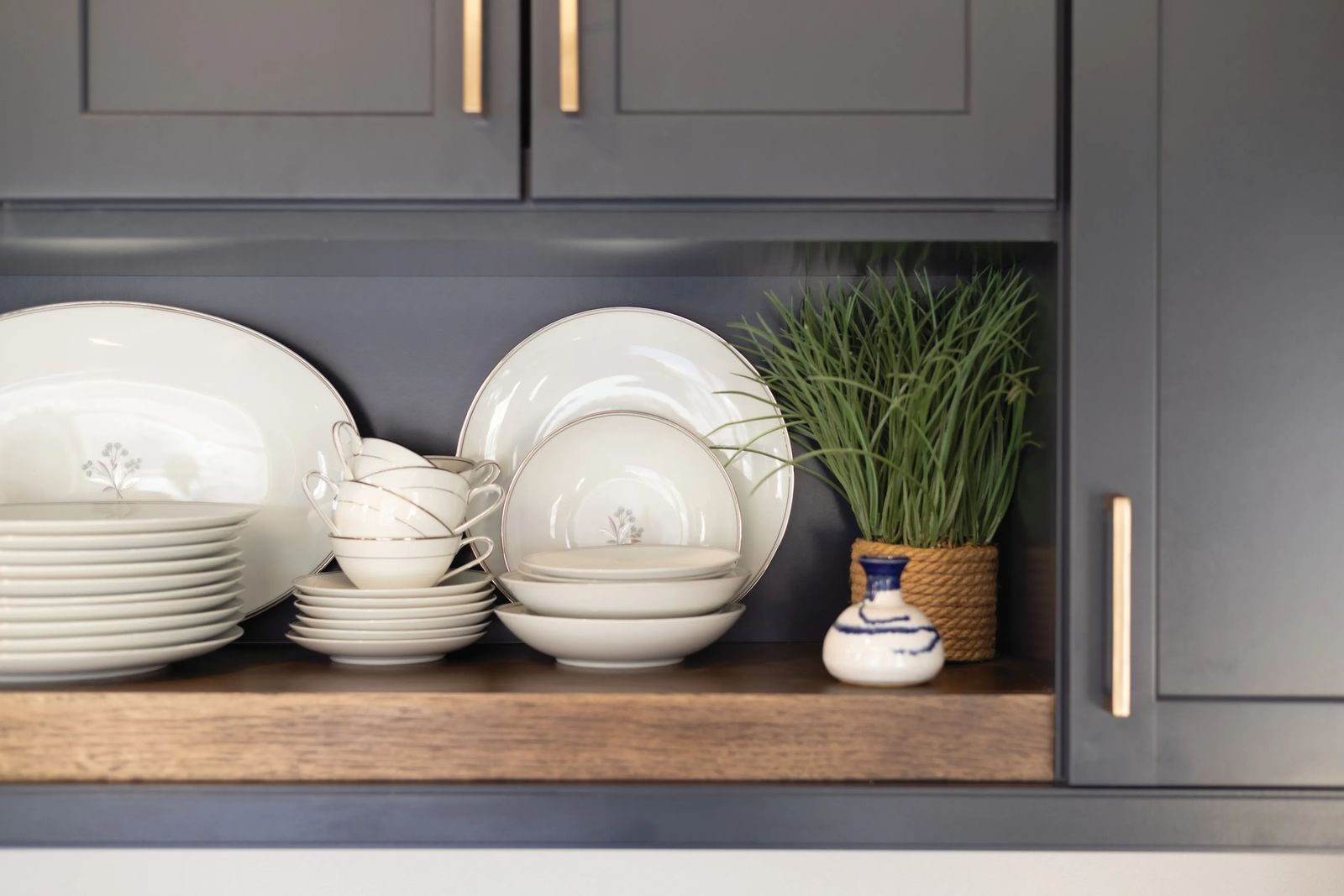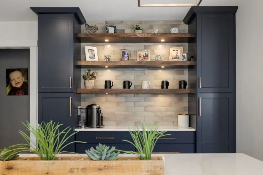 Another interesting hue in the room can be found in the floating shelves, along the island, and in the hood above the stove, which are all hickory. The wood is not only durable but impeccably cohesive with the ceiling.