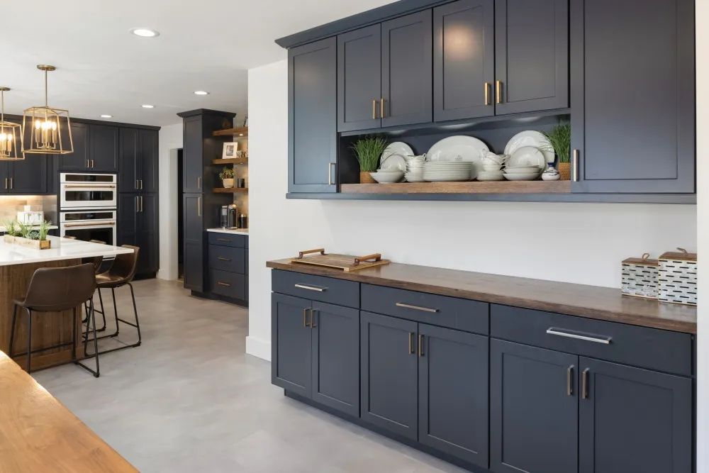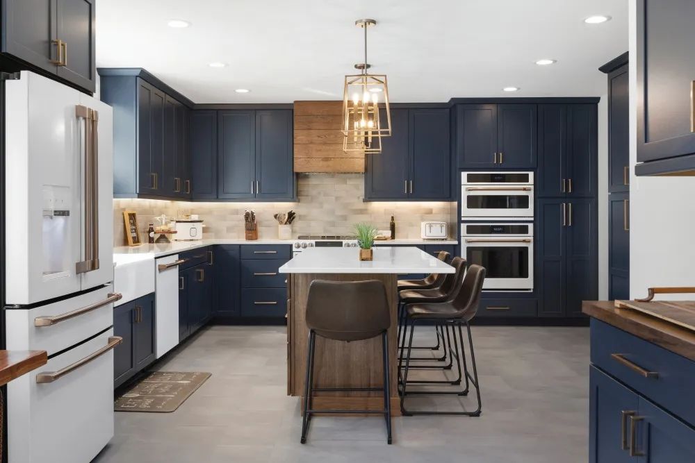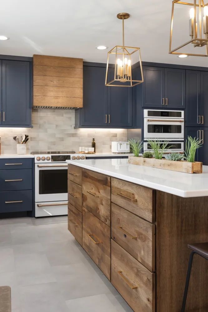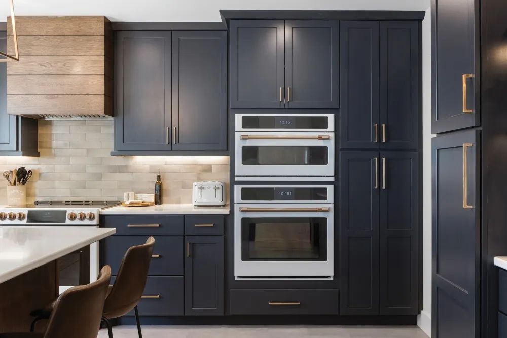 “The appliances are what inspired it all,” Erica said of their color choices. “Then the designers at Hannesson Homes pulled together a color palette that would tie in the Café appliances.” The cupboards are a deep matte navy with coordinating brass handles that are as timeless as they are sophisticated. “I love how the navy cabinets are highlighted by the brass in the handles and how the backsplash and the brass are pulled into the mix with the veins in the white quartz countertop,” Braxton said of the colors and textures used to create their dream kitchen.