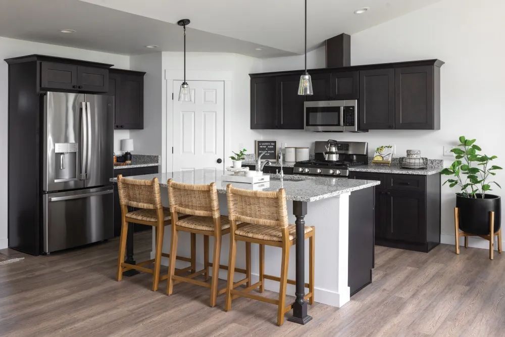 One pleasing benefit of the home’s modest footprint is its ease of upkeep and maintenance. The kitchen, while still chef-worthy and will comfortably accommodate guests, is no exception. Its economical size includes everything you need and nothing you don’t, making clean-up a breeze. The moody black cabinetry and stainless steel appliances pop against the white walls while the grey-speckled countertops unify the space. Take a seat at the kitchen island or unwind at the naturally lit adjoining dining area.