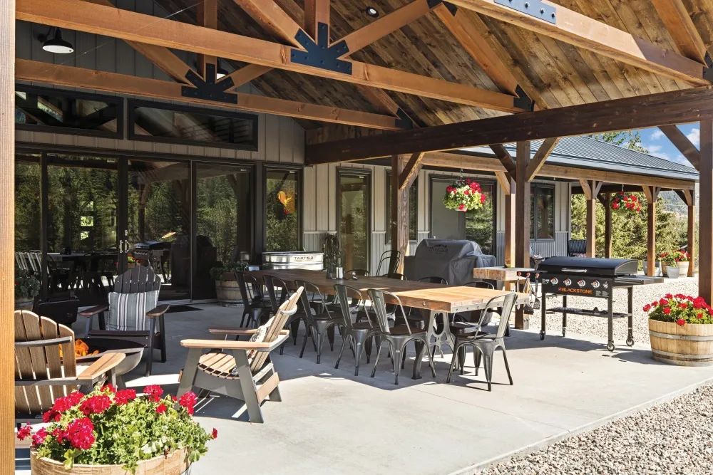 Red geraniums can be spotted throughout the property and are a beautiful reminder of Dorothy’s favorite flower. Joni says this was the most meaningful outdoor element because “it made me think of Dort, as we called her, every time I looked at them.” These rocking chairs outside the primary suite were purchased at the Red Lodge Amish store West Bench and are a favorite place for early risers, Jay and Joni, to sip their morning coffee and watch the sunrise.