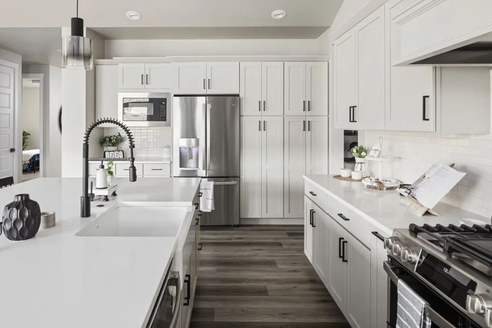 The home’s kitchen is the star of the show, with bright, white cabinetry, a beautiful range hood, tiled backsplash, and quartz countertops. The space sparkles.